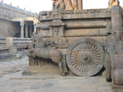 Carving of chariot wheels in the temple. These are carvings on the base on which the sanctum stands.