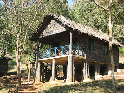 There are about 8 tented cottages and 3 log huts available at the resort. There are also a few well appointed rooms at the hunting lodge which also houses the main office. We had tried to book one of the log huts, but even more than 3 months back, they were all booked, and we had to settle for the last tent available. However, staying in the tented cottage itself was a wonderful experience. Two cane chairs outside beckoned us, and inside, it was roomy and contained a double bed and a couple of tables and clothes-hanger. A door behind the tent led to a large bathroom. Very basic, but sufficient and comfortable. We were warned to strictly keep the door closed at all times, for the area was full of monkeys who wouldn’t hesitate to take over our room at the slightest chance.