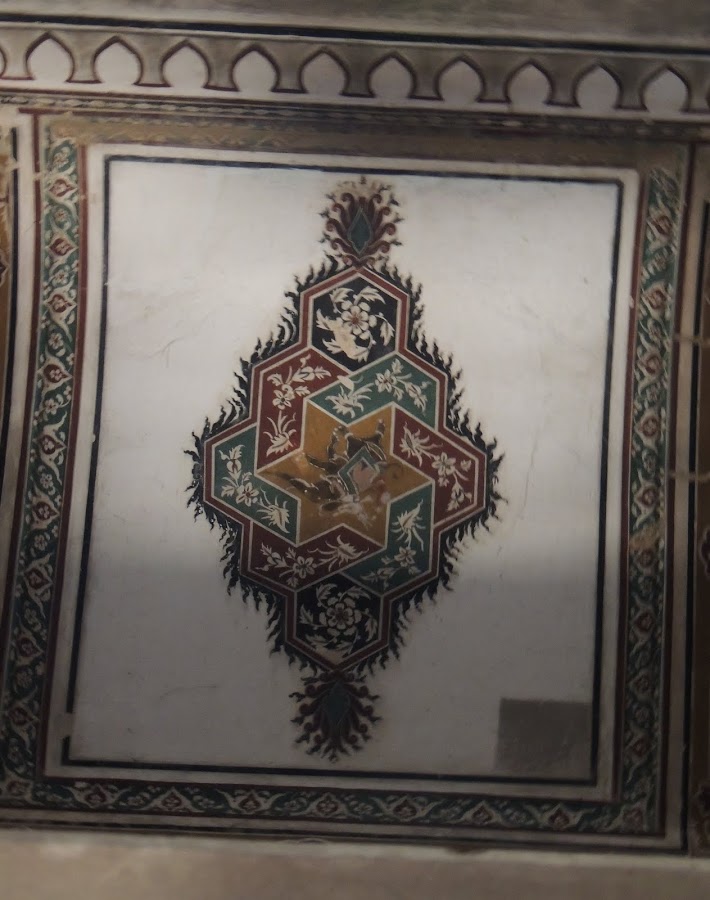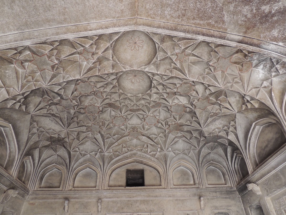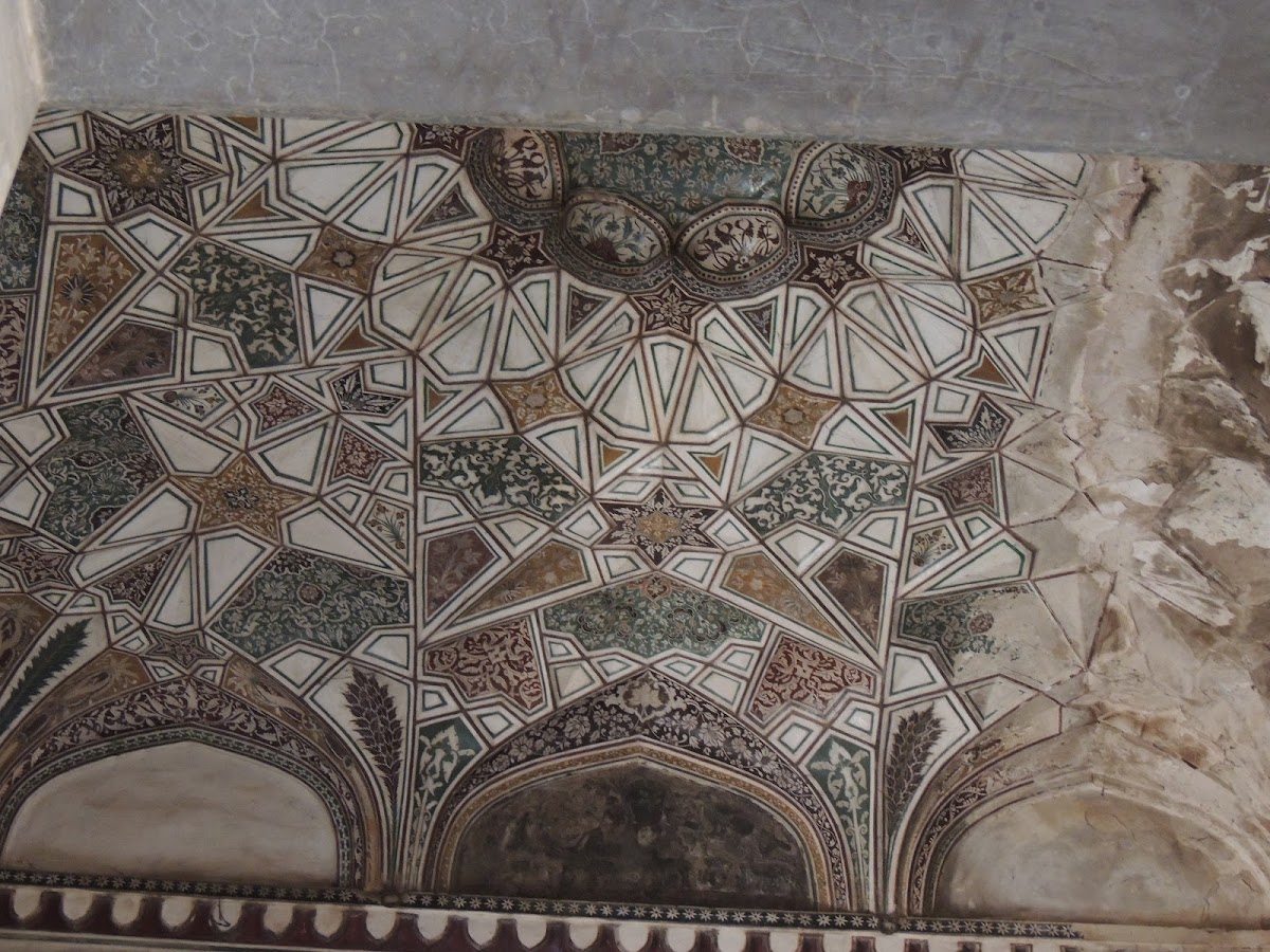 | The ceiling of one of the central rooms, which might have been a sort of audience hall. Believe me, it looks way more impressive than it appears in this photograph! And while I am not sure, I would think this is inlay work, though I have never seen it on ceilings before. |