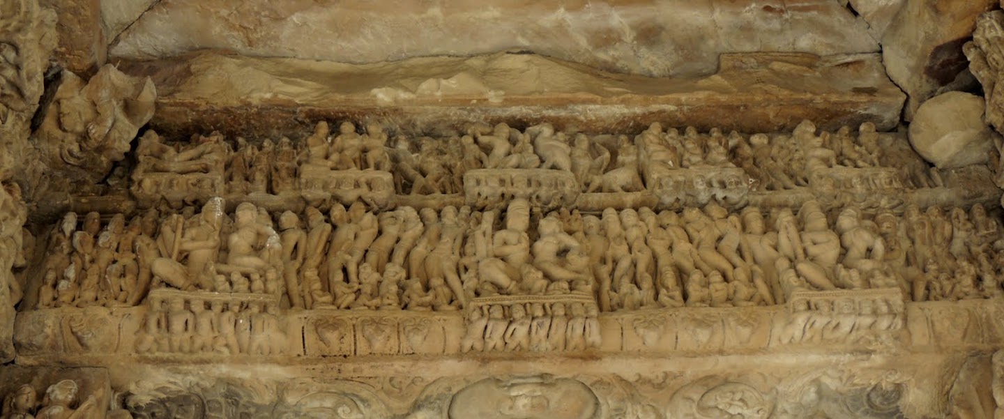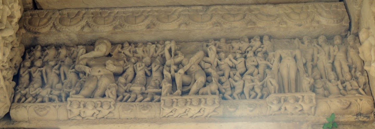 | The central figure in the bottom panel holds a danda (staff). I wonder if it could be Lakulisa? and the panel above is interesting as well, showing people going in a procession. |