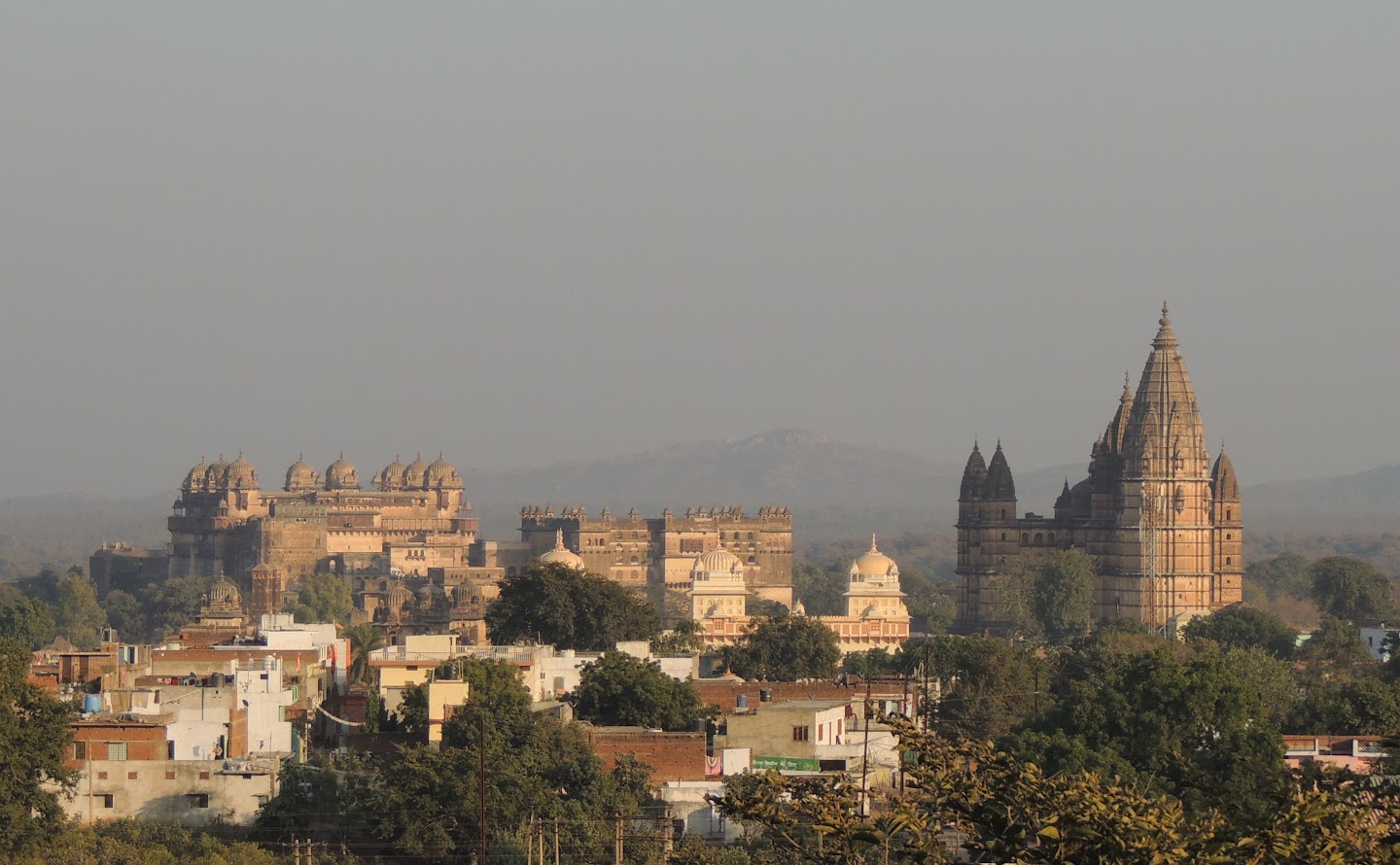 | View of the monuments from the Lakshmi Narayan Temple.. from the left, the Jehangir Mahal, the Raja Mahal and the Chaturbhuj Temple |