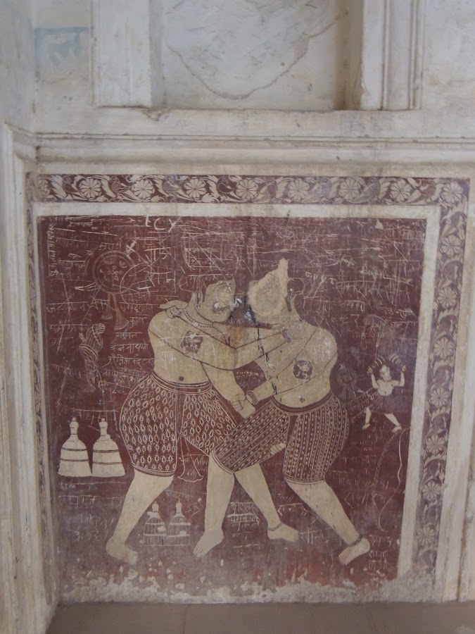 | Wrestlers in a panel on the walls of the temple, defaced with scribbling |