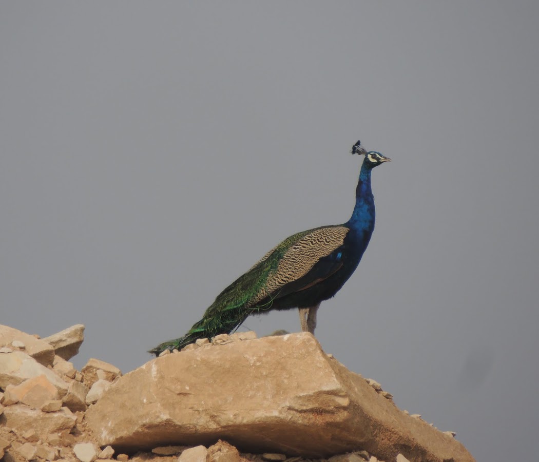 | Peacocks we saw in plenty, almost everywhere we went. But this one was the best. He posed so beautifully atop the rock, somewhere on the road near Gwalior |