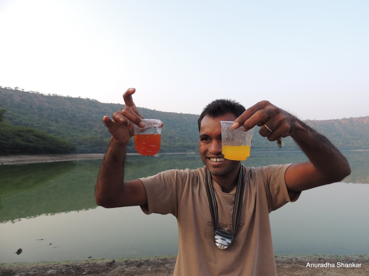 Our guide, after telling us of the legends, was eager to demonstrate his scientific temper as well. He was all set with a bit of turmeric wrapped in newspaper and two plastic glasses. Filling one with water from our bottles and one from the lake, he proceeded to show us how the turmeric turned a bright red in the lake water, proving its alkaline nature. I thought back to my school days, wishing I had learnt chemistry like this, on the field!