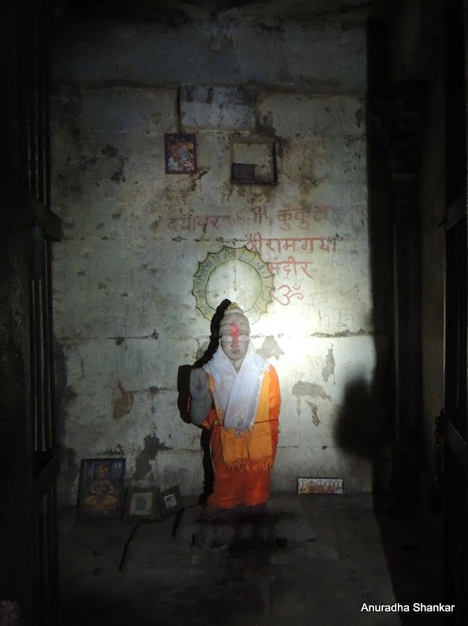 We were, however, more interested in the temples which were dotted along the shore. There are said to be twenty seven temples in the crater, of which only a few stand today. The first temple we came to, which was also the temple we had spied from the path while climbing down, was the Ramgaya temple. Built with a central shrine and an mandapa, it must have been quite an ornate temple in its heyday. Today, a Krishna statue stands in the shrine, a recent addition, and most of the temple is crumbling.