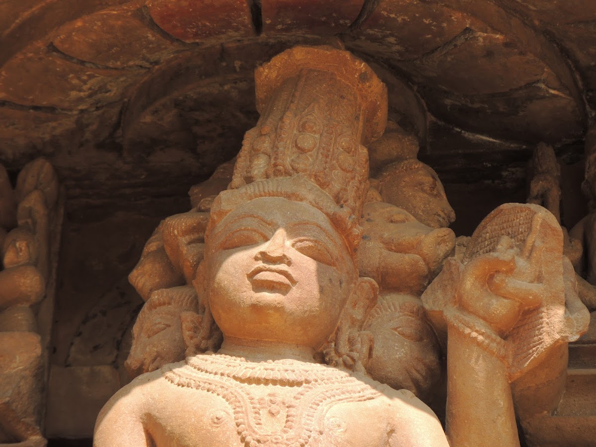 The so called Chitragupta temple is actually dedicated to Surya, the Sun God, and a majestic image of Surya riding his chariot of seven horses stands in the sanctum. On one of the outer niches of this temple is the unique sculpture of a 11 headed Vishnu, seen nowhere else!