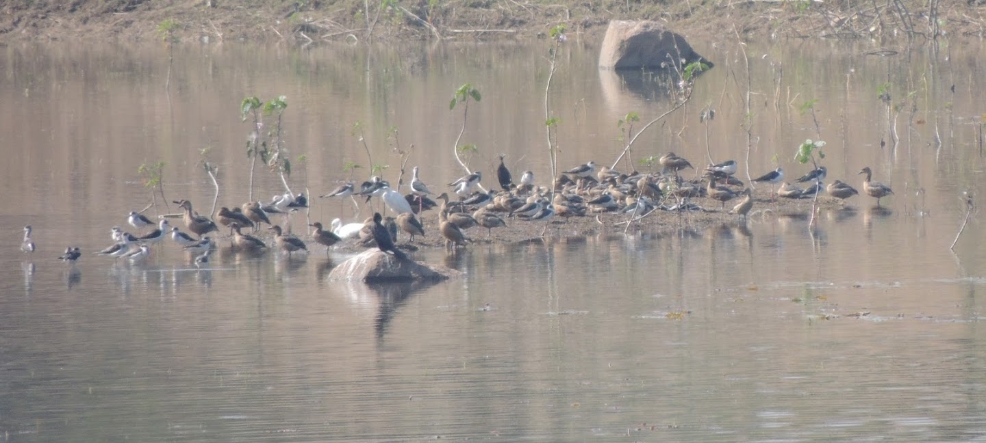 I can identify Cormorants, Egrets, Stilts and Little Grebes among this flock of birds.