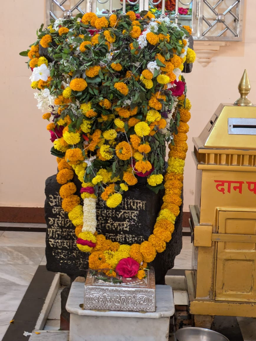 I was intrigued by this, and very curious to see the idol, which, as I anticipated, was covered by clothes and flowers, no detail visible. Hence, I had planned to attend the temple at the time of the abhishek, which, I thought would be the perfect opportunity to see the idol as it was, without the decorations. I had found a number online and spoken to a priest, who had told me that the abhishek would start around 10 AM. Unfortunately, we got a bit delayed, and reached just after it began. I was disappointed to see that there was no sign of abhishek to the main deity, and instead people were gathered in the small area just outside the garbagruha (the main shrine). Confused, I spoke to the priest whom I had communicated with earlier, and he explained that the abhishek would be done, not to the main deity, but only to a silver replica of the deity. This replica had been made a few years back, exactly duplicating the idol, since the ancient idol was getting eroded. Further, he said that this was just the first batch, and that we could join the second batch of abhishek. However, only gents could do the abhishek, so only Shankar could go in. Further, he had to take a bath, and wear a dhoti and angavastra, both of which were provided by the temple.